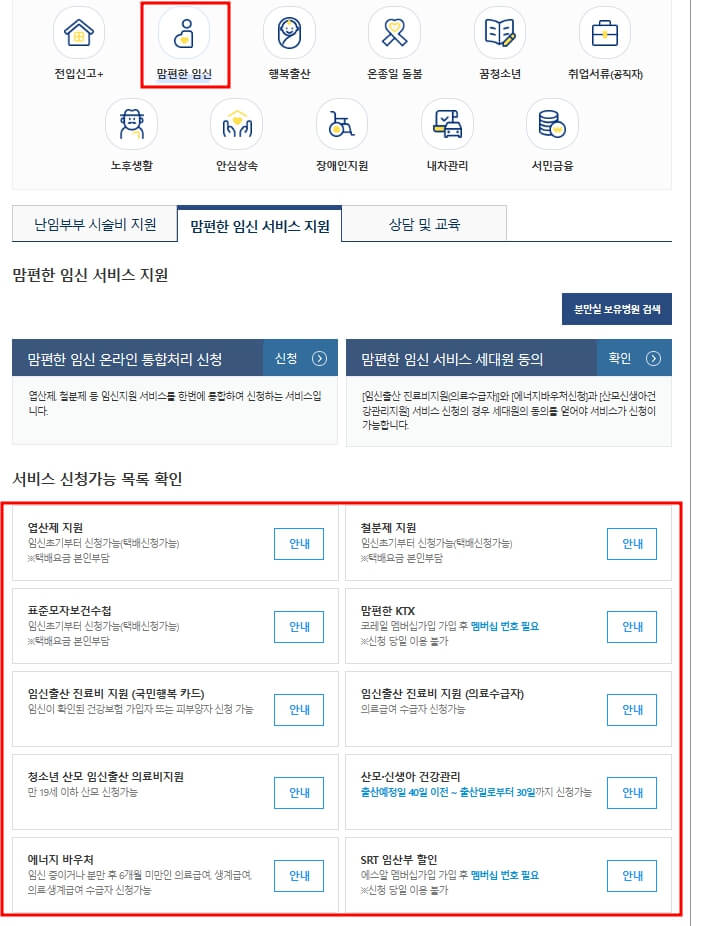 | 전국 공통 서비스 | 일괄신청 | - 임신, 출산, 진료비 지원.(국민행복카드 / 의료급여수급자) - 철분, 엽산제 지원. - 맘편한 KTX, SRT 임산부 할인 - 산모. 신생아 건강관리지원 - 표준모자보건수첩, 에너지 바우처, 청소년 산모 임신. 출산 의료비 지원. |