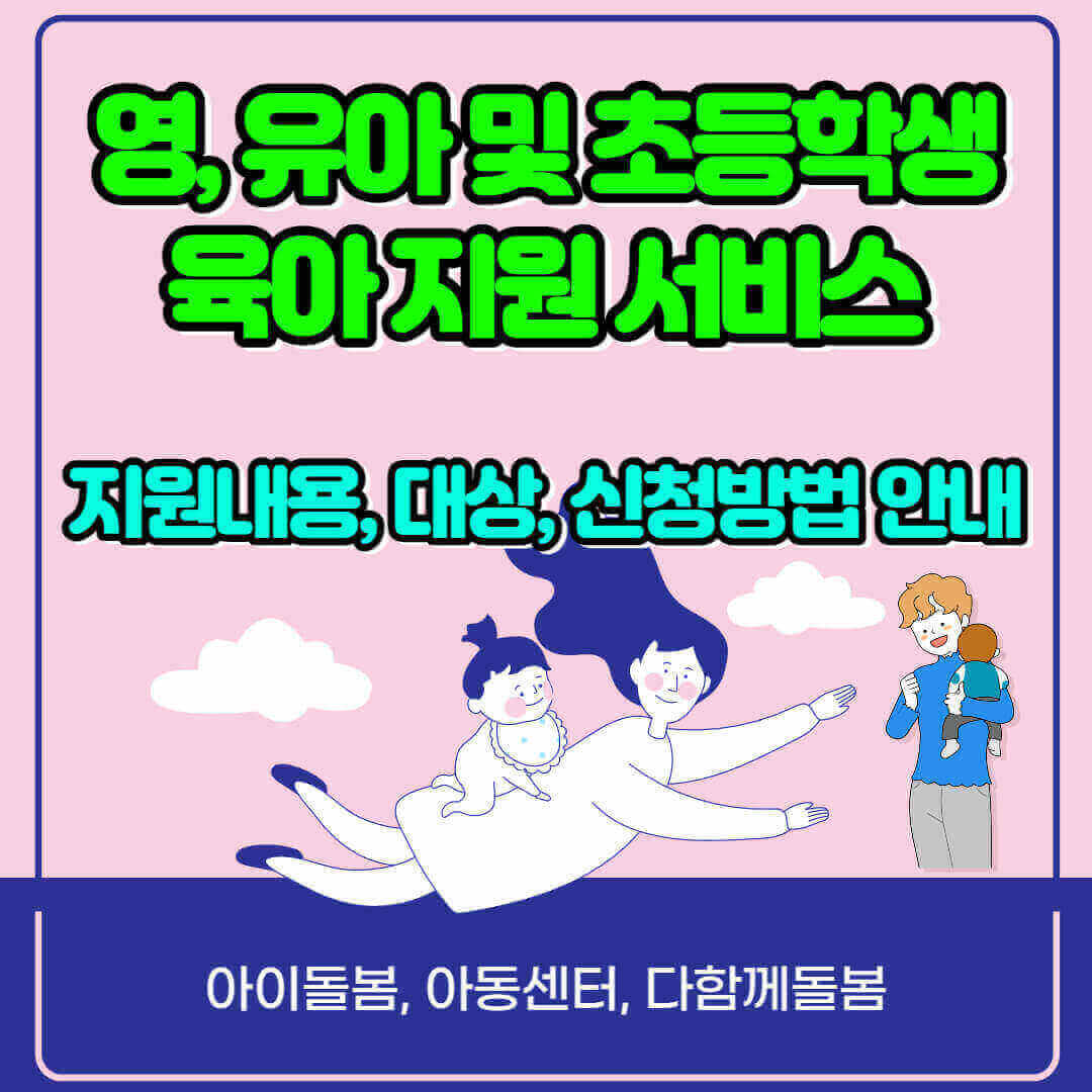 출산 후 소득활동으로 자녀 육아에 공백이 생기지 않도록 도와주는 돌봄 서비스를 모아보았습니다. 영. 유아부터 초등학생까지 안전하게 믿고 맡길 수 있는 서비스 제도의 지원내용과 신청방법, 지원대상까지 자세히 알아보겠습니다.