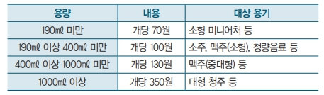 - 빈 용기 보증 대상 제품 : 주류(주세법 제5조 제1호. 제2호), 음료 및 먹는 물 중 반복 사용이 가능한 유리용기를 사용하는 제품으로 용기에 빈 용기 보증금의 환불 문구 및 재사용 표시가 있는 제품.
